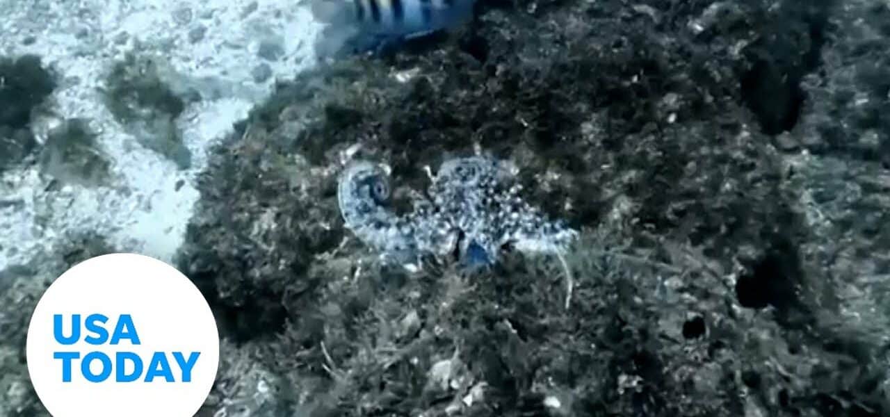Annoyed octopus swats tentacles at playful fish swimming nearby | USA TODAY