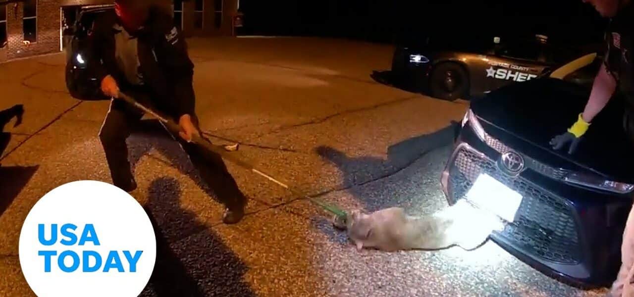 Video shows the moment when officials in Wisconsinsaved a bobcat stuck behind the grille of car on Tuesday night, using a pole to remove the animal and put it in the back of a vehicle.