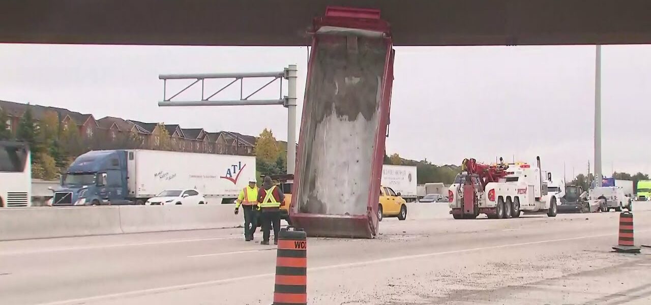 The container of a dump truck became stuck underneath an overpass on Highway 401 in Mississauga, Ontario