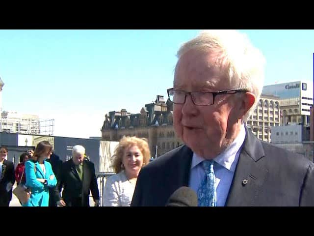 Mike Le Couteur speaks briefly with former prime minister Joe Clark as he arrives at Parliament Hill.