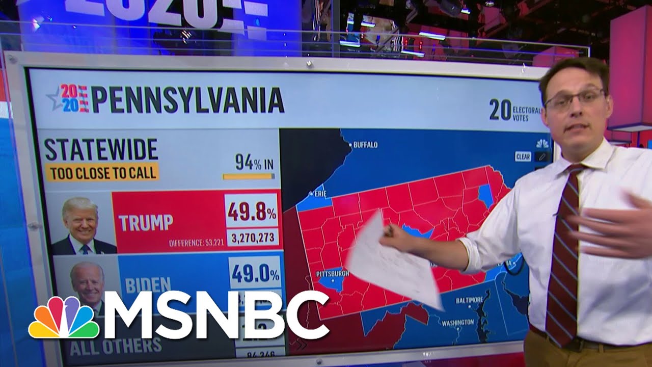 Steve Kornacki breaks down the latest ballots coming in for Pennsylvania. Kornacki says that if mail-in ballots continue to follow the trend of favoring Vice President Joe Biden, then "Philadelphia itself would be more than enough to vault Biden over Trump in that statewide lead." Aired on 11/05/2020.