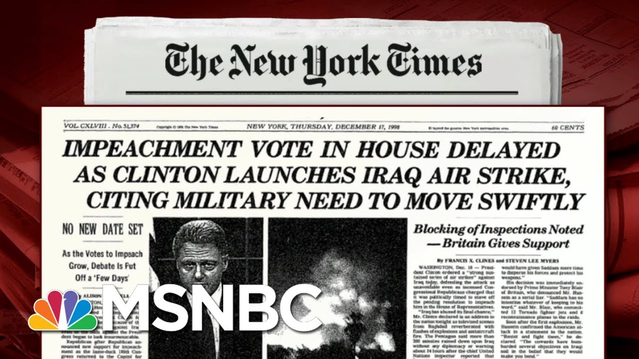 In December 1998, the New York Times ran a cover story on the delay of the impeachment vote on Bill Clinton due to Clinton's launch of an 'Iraq air strike'. Aired on 1/3/20