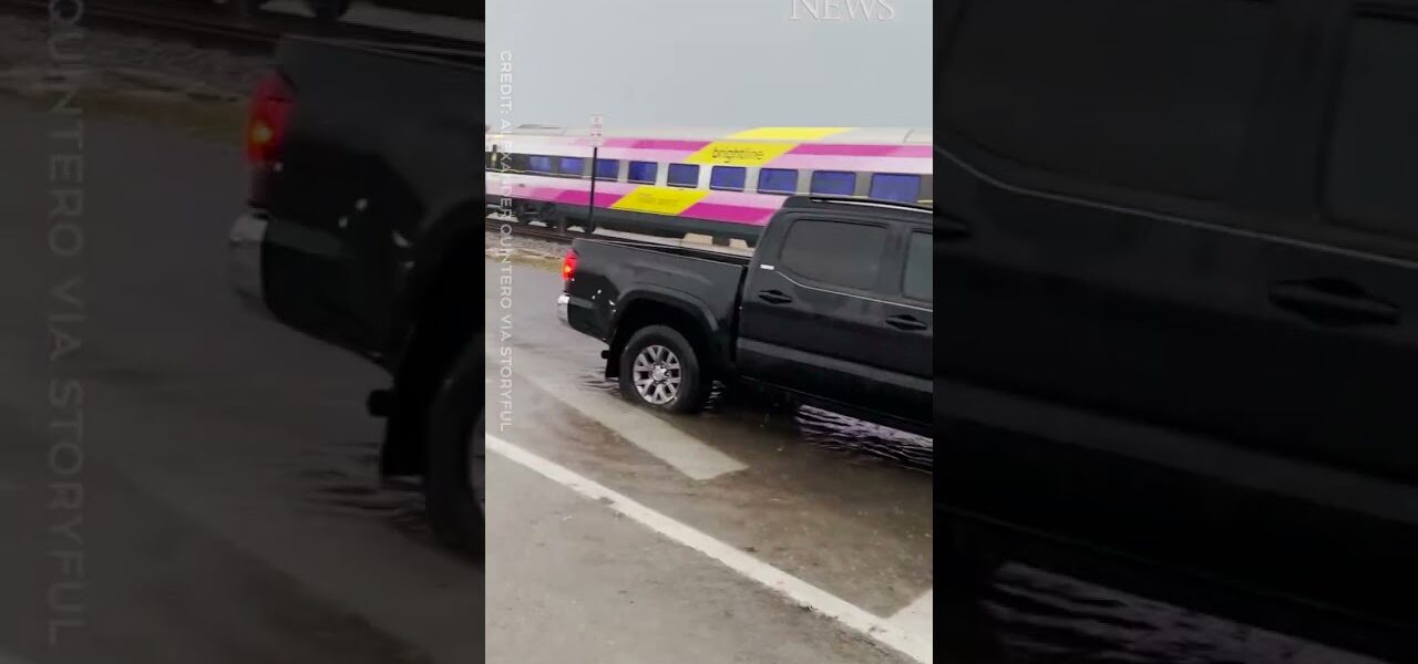 WATCH: A train crashed into a car hauler that was stuck, sending several cars flying and knocking down powerlines in Florida.