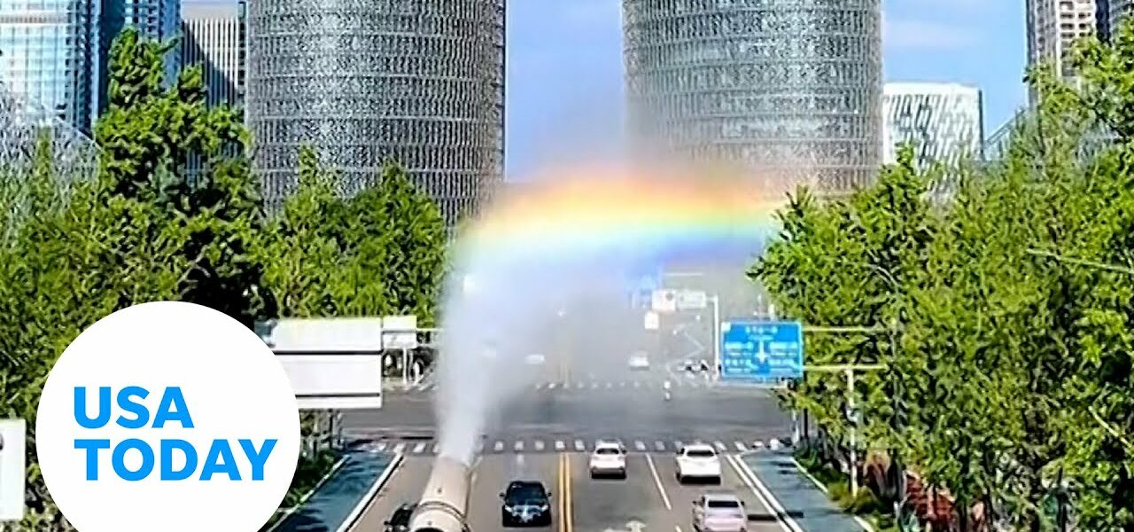 A vibrant rainbow followed a fogger truck that emits mist particles into the air to combat pollution in China.