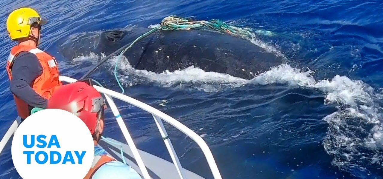 Mother humpback whale freed from thick fishing line